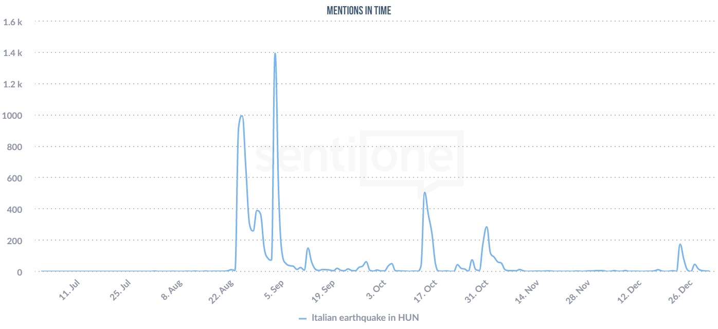 This chart shows the hour based online pulse of the Italian earthquake in Hungary (Oct, 2016) and how it resonated later on. What you see is: an instant high peak from null, then a setback, then a smaller peak again, when new context is given. And so on & on & on.