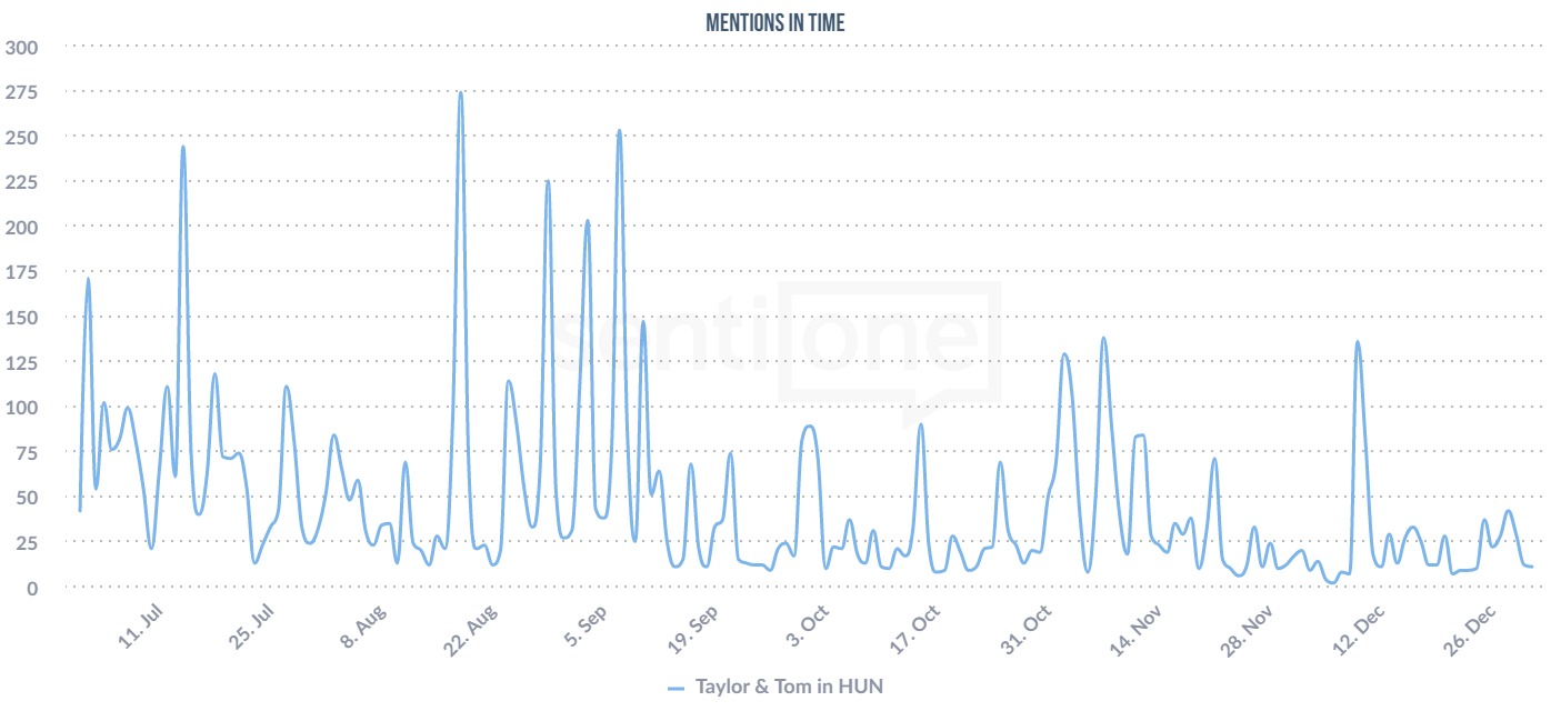 This is Taylor Swift (’s life, scandals, lows and peaks) online (HUN, July – Dec 2016). There is a constant subtle buzz, but it is new hooks that get her high in the air time after time (she giving a huge donation, she breaking up with Tom Hiddleston (September)).