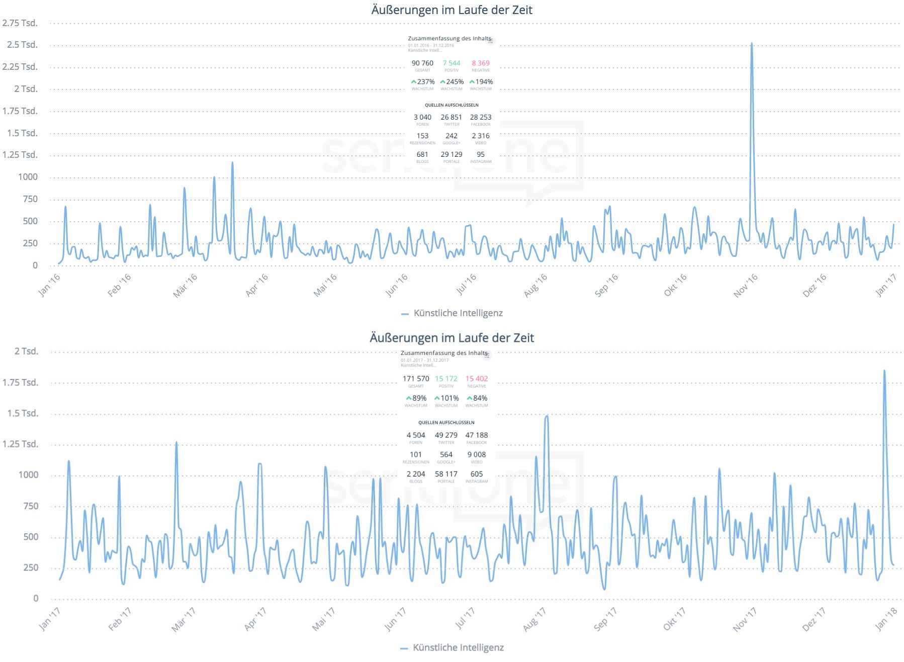 Der Vergleich zeigt deutlich, dass das Thema Künstliche Intelligenz immer mehr an Bedeutung gewinnt. Gab es im Jahr 2016 knapp 91.000 Online-Erwähnungen und Äußerungen, so hat sich die Zahl letztes Jahr beinahe verdoppelt.