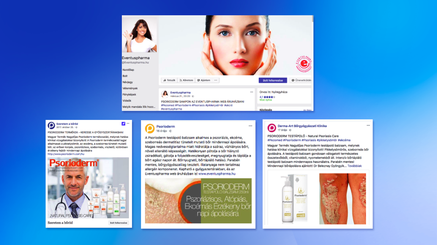 Az Eventuspharma webshop, a Szeretem a bőröd Facebook oldal, a Psorioderm hivatalos oldala és a Derma Art Bőrgyógyászati Klinika például mind egy – valószínűsíthetőleg saját – és recept nélkül is kapható termék mögött áll, több saját platformot is becsatornázva a reklámtevékenység mögé.