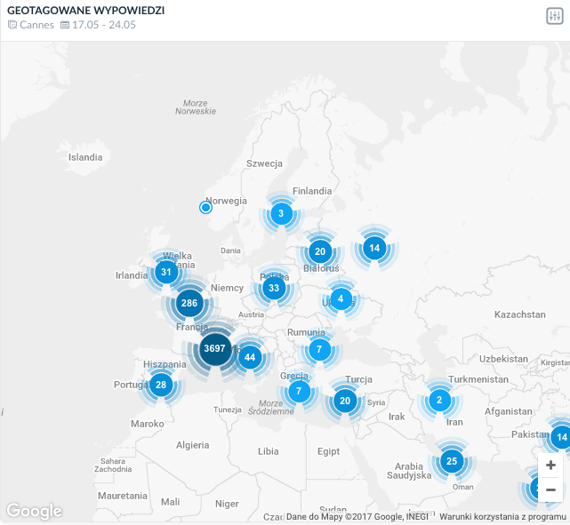 Sprawdziliśmy na mapie geolokalizacji SentiOne, w których miejscach meldowały się osoby piszące o Cannes. Zdecydowana większość z nich znajdowała się oczywiście we Francji, jednak nie zabrakło wzmianek w całej Europie: