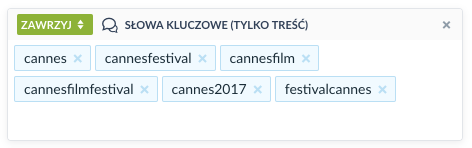 Jak widać, dostosowując się do sieciowych trendów (m.in. uwzględniając używanie hashtagów) niektóre frazy specjalnie napisaliśmy łącznie. Taki zabieg pozwolił nam zebrać prawie 20% więcej wzmianek, niż przy użyciu samego słowa “Cannes”.