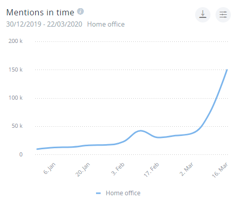 Wzmianki haseł „home office” i „remote work” w czasie
