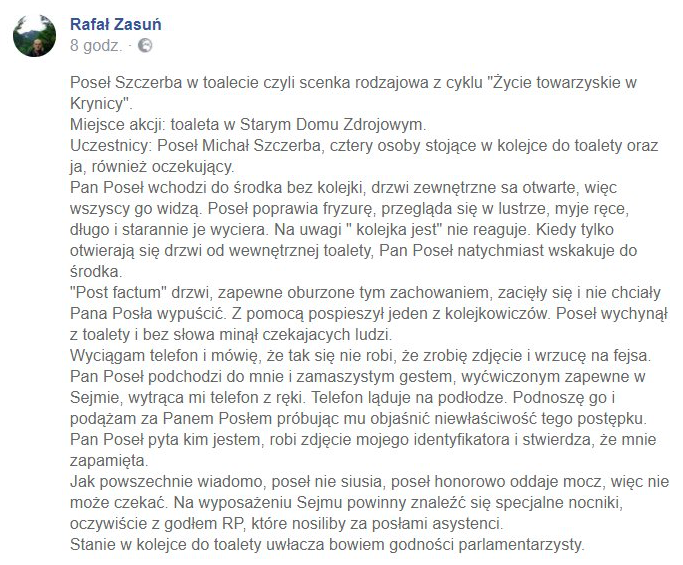 Wśród llicznych obserwatorów online dużo większe wrażenie robią takie tematy, jak zachowanie posła Michała Szczerby, opisane na Facebooku przez dziennikarza portalu wysokienapiecie.pl, Rafała Zasunia :