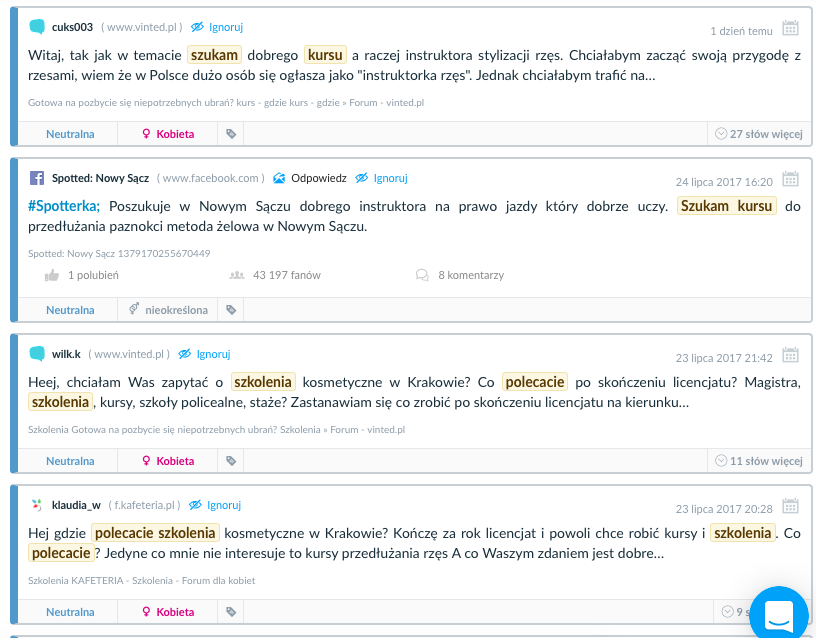 Tylko tyle wystarczy, aby włączyć się w dyskusję i przekonać do siebie klienta. Całą ścieżkę możesz oczywiście zmodyfikować, wpisując dowolne słowa kluczowe i stosując różne filtry, w łatwy i szybki sposób dostosowując je do swojej branży i potrzeb.