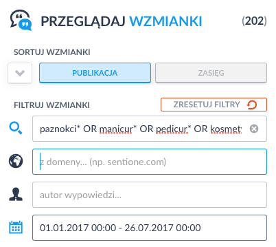 Zawężam go więc, w sekcji “Wzmianki” filtrując tylko według słów powiązanych z moją branżą. Na końcu każdego z nich użyłem symbolu * w którego miejsce mogą pojawić się dowolne zakończenia wyrazów – dzięki temu nie muszę każdego z nich odmieniać przez przypadki ?