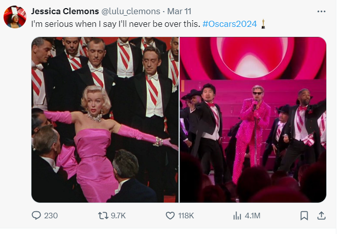 W 1953 roku Marylin Monroe, cała na różowo, śpiewała „Diamonds Are a Girl’s Best Friend”. Ta kultowa scena z filmu „Mężczyźni wolą blondynku” zdecydowanie przypomniała się internautom, gdy ubrany w równie różowy garnitur Ryan Gosling zaczął śpiewać „I’m Just Ken”, swoją hitową piosenkę z filmu „Barbie”. I chociaż aktor nie wyszedł z gali rozdania z nagrodą dla Najlepszego aktora drugoplanowego, to jego wystąpienie w towarzystwie Slasha z Guns N’ Roses i Marka Ronsona na pewno będzie jeszcze długo oglądane na YouTube: