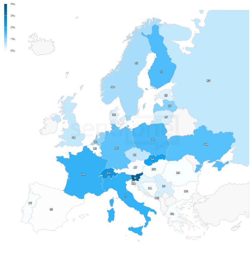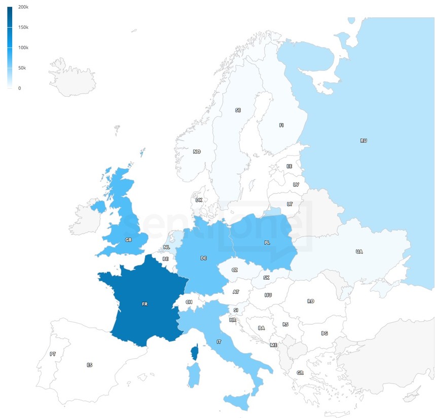 Wróćmy jednak do sportu. Powszechnie wiadomo, że mistrzami zimy są Skandynawowie. Klasyfikacja medalowa tegorocznych igrzysk potwierdza ten trend – wygrywają ją zdecydowanie Norwegowie, którzy na tych igrzyskach zdobyli 39 krążków. A jak rozkłada się liczba wypowiadających się w sieci na temat igrzysk? W Europie najczęściej dyskusje z hashtagiem #PyeongChang2018 prowadzili… Francuzi! Szwedzi, Norwegowie i Finowie popełnili niewiele wzmianek względem innych krajów, co doskonale widoczne jest na poniższej mapie: