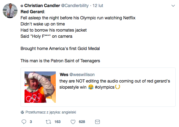 Złote dziecko amerykańskiego snowboardu – tak chyba możemy już powiedzieć o Redzie Gerardzie, który zdobył w tym roku pierwszy krążek tych igrzysk dla USA. Nie byłoby w tym nic dziwnego, gdyby nie fakt, że chłopak wygrał zawody niemal na nie zasypiając, bo… do późna oglądał serial (Brooklyn 9-9). Chwilę po pobudce, której podjął się kolega z zespołu, wybiegając z pokoju Red zorientował się, że nie ma kurtki, w której powinien startować. Tu również z pomocą przyszedł przyjaciel, użyczając swojej. Zdobywając złoto w slopestyle’u, siedemnastolatek nie tylko otworzył Amerykanom igrzyska, ale stał się też najmłodszym medalistą tej dyscypliny w historii kraju. Co ciekawe, został też pierwszym medalistą olimpijskim, który urodził się w roku 2000.