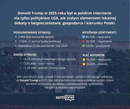 Pod względem tonacji przekazu, dominował ton neutralny, stanowiący około 80% wszystkich wzmianek. Tylko około 17% tekstów miało wydźwięk negatywny, a jedynie 3% pozytywny. Co istotne, w polskich mediach Trump w 2025 roku funkcjonował głównie jako temat informacyjny, a nie jako postać wywołująca silne emocje. Jego działania były relacjonowane raczej obiektywnie, a prawdziwe pole do wyrażania opinii zdominowały raczej social media, gdzie toczyły się intensywne dyskusje na temat jego polityki i działań.