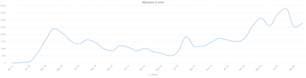 The above graph shows combined Twitter and Facebook mentions for the conspiracy theory. The large dip from August to September this year can be attributed directly to these networks choosing to ban QAnon-related content from their networks.