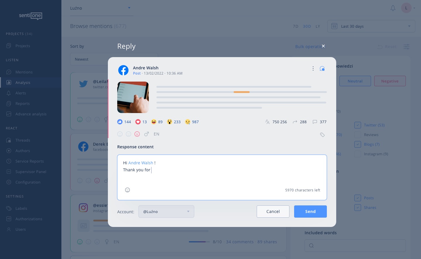 Los datos contenían información sobre el comportamiento del consumidor, afirmación del sentimiento, así como métricas demográficas. SentiOne ofreció un análisis de datos en tiempo real que a su vez proporcionó insights útiles basados en un análisis de menciones multicanal. Adicionalmente, al utilizar herramientas basadas en APIs proporcionadas por las plataformas más grandes de redes sociales, SentiOne optimizó el enfoque de la agencia en menciones en línea. Debido a esto, Luzno podía responder las consultas realizadas a través de todos los canales desde una única herramienta.