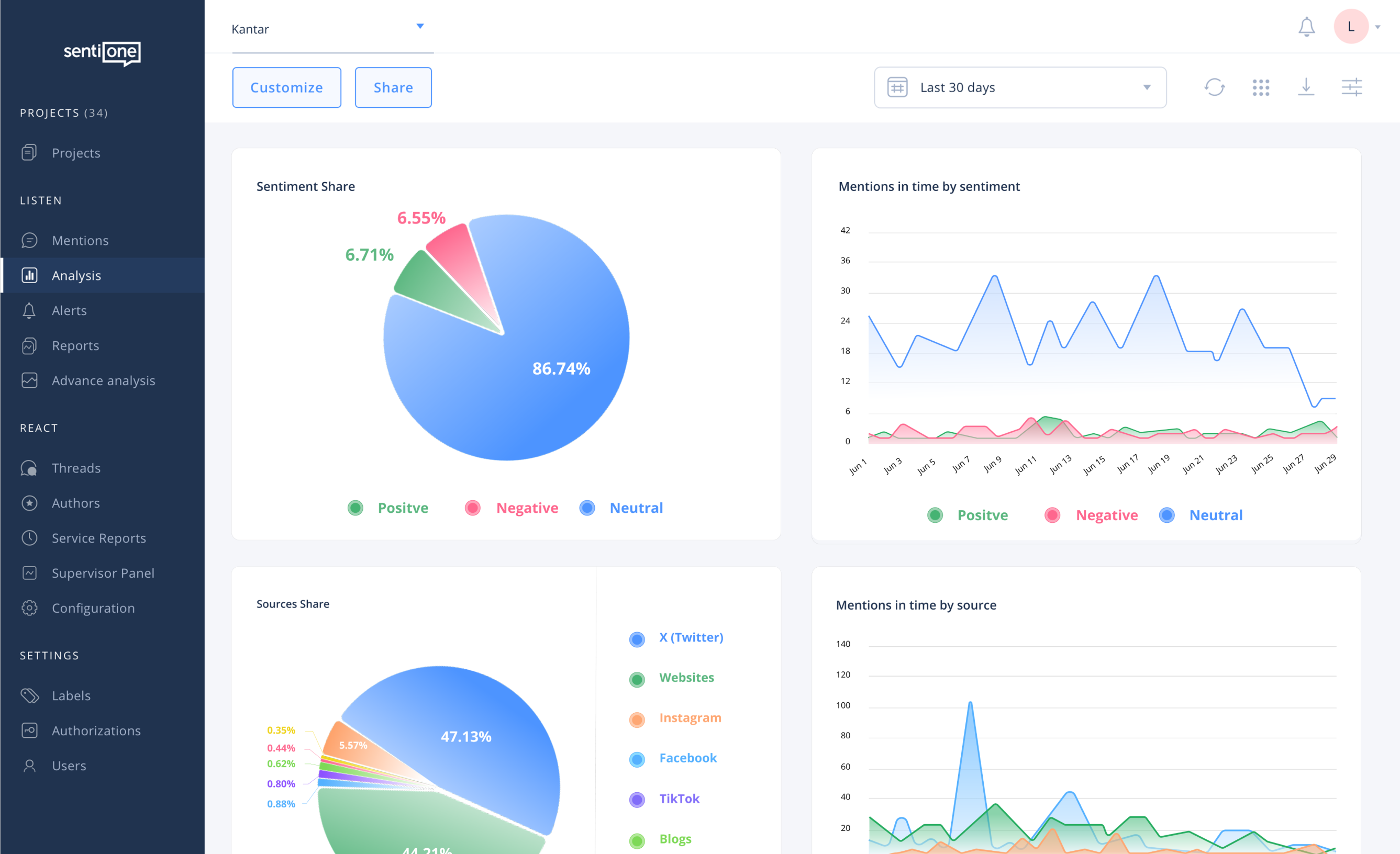 Despite concerns, data revealed a surprising insight: The majority of public sentiment remained neutral or positive. By integrating SentiOne's live social data, Kantar was able to confirm that brand perception was not as negative as feared. They supported the client's internal communications and investor relations teams with trustworthy data and showcased transparency and data-backed strategy to stakeholders. This holistic, multi-source approach helped the client navigate the reputational challenge with confidence and reinforced long-term trust.