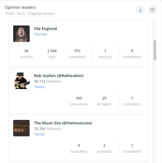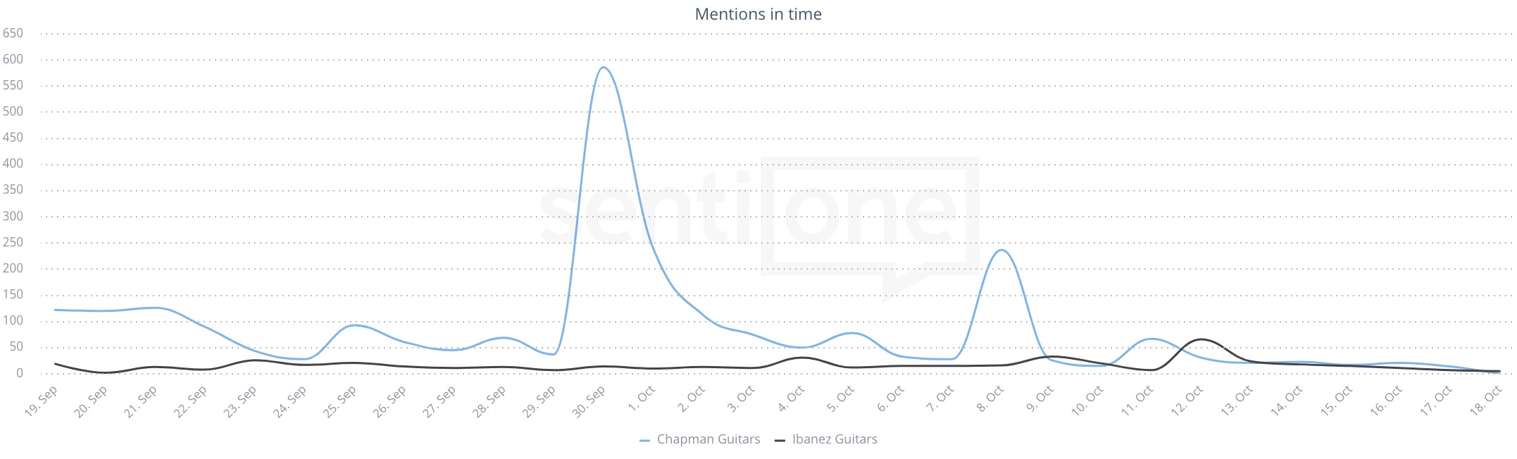 Let’s have a look at one of my favourite industries – musical instruments. If we look at two guitar brands and Ibanez in the last 30 days, we can see that there was a massive peak in mentions on September 30.
