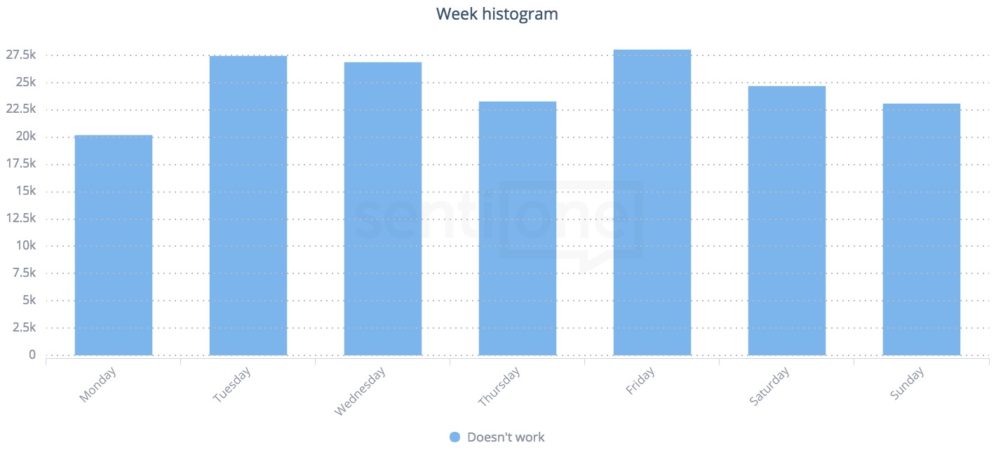 For the last five years, I’ve been analysing online mentions all over the web. Online monitoring is a phenomenal tool – a true treasure trove, filled with interesting knowledge concerning the whole society. I’d like to reassure everyone, that there’s no nation that complains the most – apparently, it’s an overall tendency with no division by regions of the world. With a help of SentiOne, we’ve checked the sentiment of mentions that include very generally defined project “it doesn’t work” and who publishes such statements the most often. Turns out that one in four people publishes such statement filled with negative emotions. What is interesting, around ⅔ of users writing such a phrase in their mentions are men – so it undermines quite popular opinion that women complain more often on malfunctioning things!