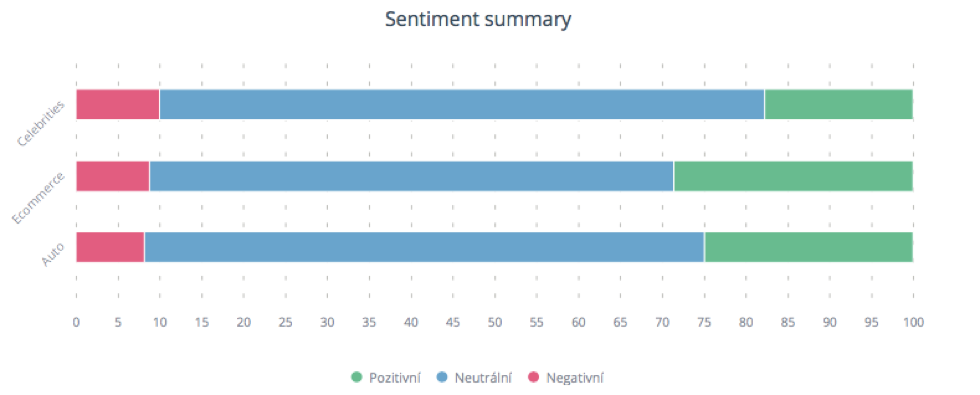 Monitorované kategorie se samozřejmě hodně liší v emocích, které vyvolává každá značka odlišně v různých obdobích. Nejpozitivnější zmínky ze všech kategorií měla kategorie Ecommerce, zatímco na druhém místě se s malým rozdílem umístily Automobily a jako poslední s nejméně pozitivními ohlasy skončila kategorie Celebrity.