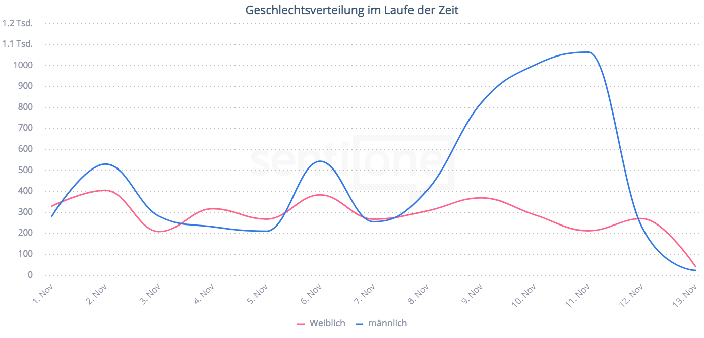 Beispieldiagramm von SentiOne wie Männer und Frauen über das Thema Fitnessstudios im Internet sprechen
