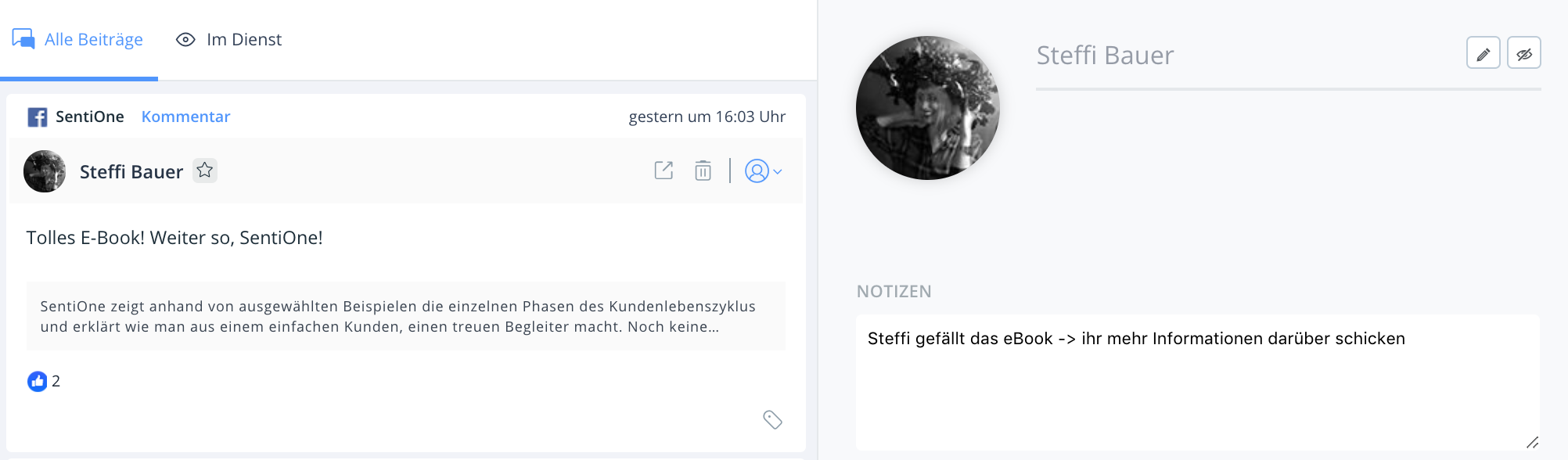 SentiOne React ermöglicht kinderleicht den Aufbau einer Kundendatenbank. Dort werden dann alle relevanten Informationen wie Alter, Wohnort und Geschlecht hinterlegt, die dann allen Mitgliedern des Kundenservice oder des Social Media-Teams zur Verfügung stehen. So bleiben besonders aktive Kunden im Fokus. Weiter wird dadurch die gute Beziehung zur Zielgruppe intensiviert.