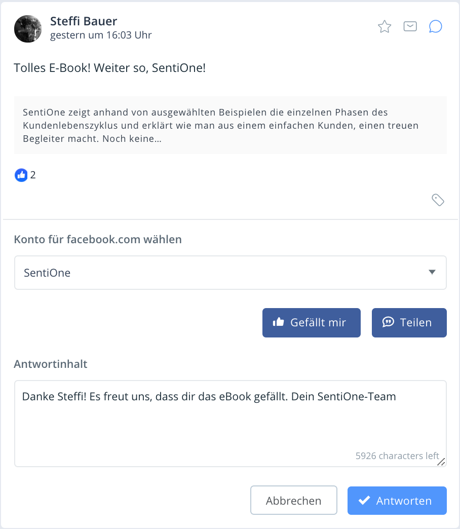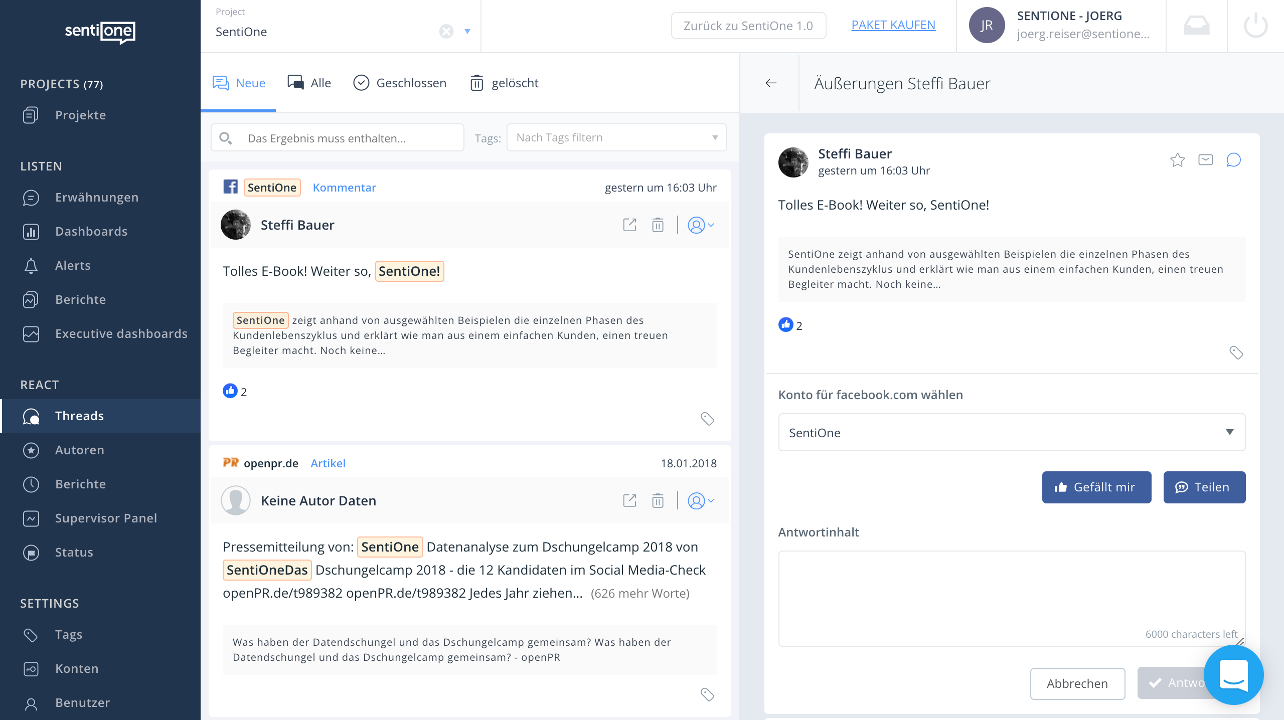 Ab sofort ist es möglich, alle Social Media-Profile eines Unternehmens auf der SentiOne Plattform zu verwalten und von dort in Echtzeit auf Fragen, Beschwerden, Verbesserungen und Kritik zu reagieren. Mit Hilfe von SentiOne React behält man nicht nur den Überblick über alle Online-Äußerungen in Bezug auf eine Marke oder ein Unternehmen, sondern kann auch ganz einfach von dort aus darauf antworten.