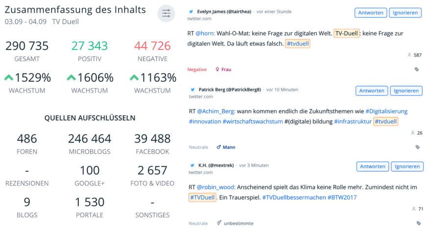 Die meisten Erwähnungen fanden direkt während des Duells statt. Aber auch noch am Tag danach sind die Sozialen Netzwerke voll mit Kommentaren rund um das TV-Ereignis.