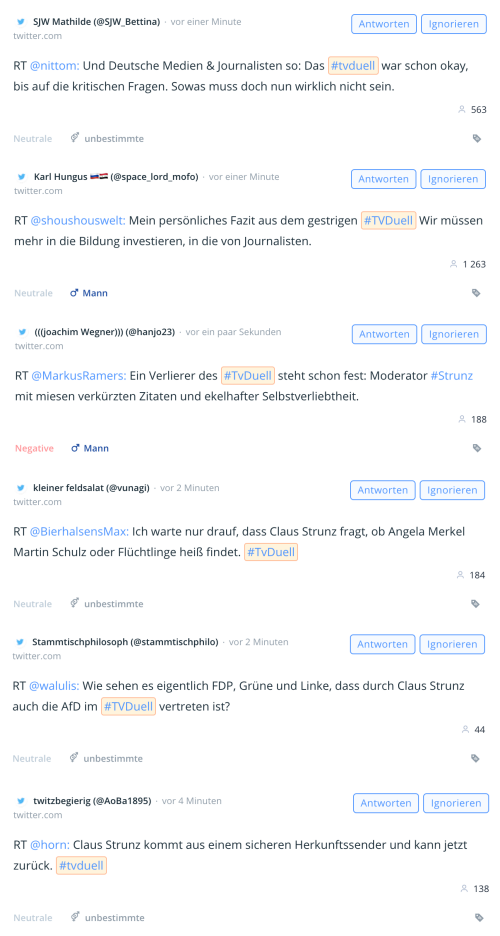Viele negative Erwähnungen beschäftigen sich aber auch mit den Moderatoren. Ihnen wird vor allem vorgehalten, auf kritische Fragen verzichtet zu haben. Einem Moderator wurde unter anderem unterstellt, zu hetzerisch nachzufragen.