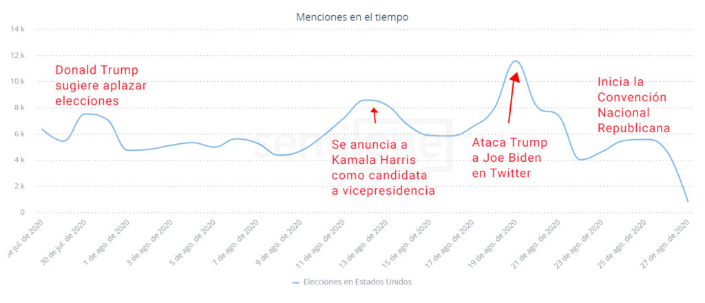 - 11 y 12 de agosto: En las fechas previas a la Convención Nacional Demócrata (del 17 al 20 de agosto) ocurrió un pico debido a que Kamala Harris apareció por primera vez junto a Joe Biden como candidata a la vicepresidencia de Estados Unidos. Las menciones se mantuvieron entre 315 mil y 326 mil.