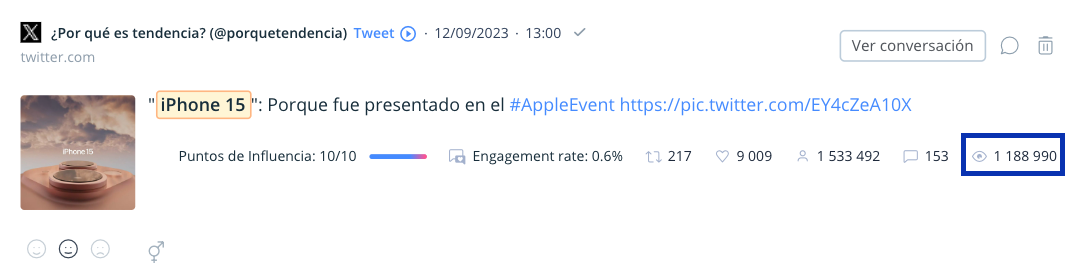 Ahora tienes el poder de descubrir el número exacto de veces que se ha visto un Tweet. Esta métrica está disponible para cada publicación. Los datos se obtienen directamente de X (anteriormente Twitter) asegurando la mayor precisión posible.