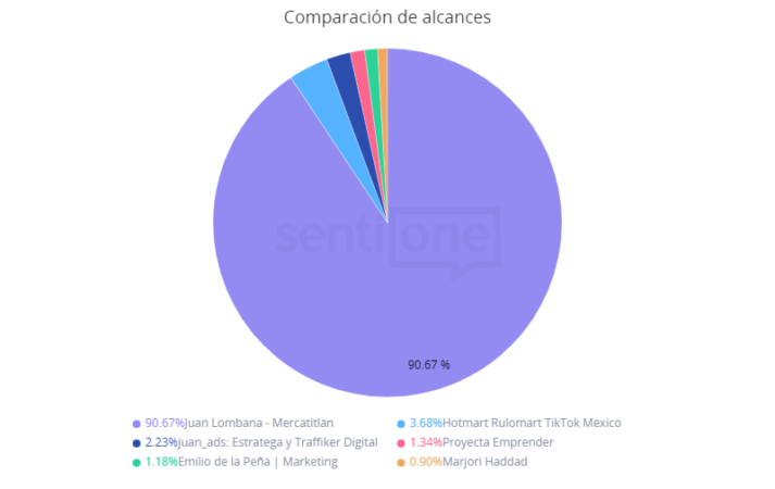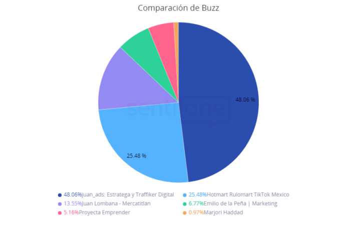 Curiosamente, en este caso, el ranking es diferente. Juan Ads es quien lidera el listado con 48.06% de buzz, seguido de Hotmart Rulomart TikTok México con 25.48%. Juan Lombana, quien es el influencer de marketing digital con mayor alcance, ahora se coloca en la tercera posición con 13.55%.