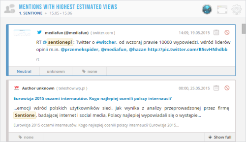 The method created by SentiOne is based on academic research that analyse Internet users’ behaviours and it’s supported by 6 months of testing. The estimation includes an adjustment related to the mention age. This means that the number of views grows with time, in accordance with the observed activity on a given website or portal.