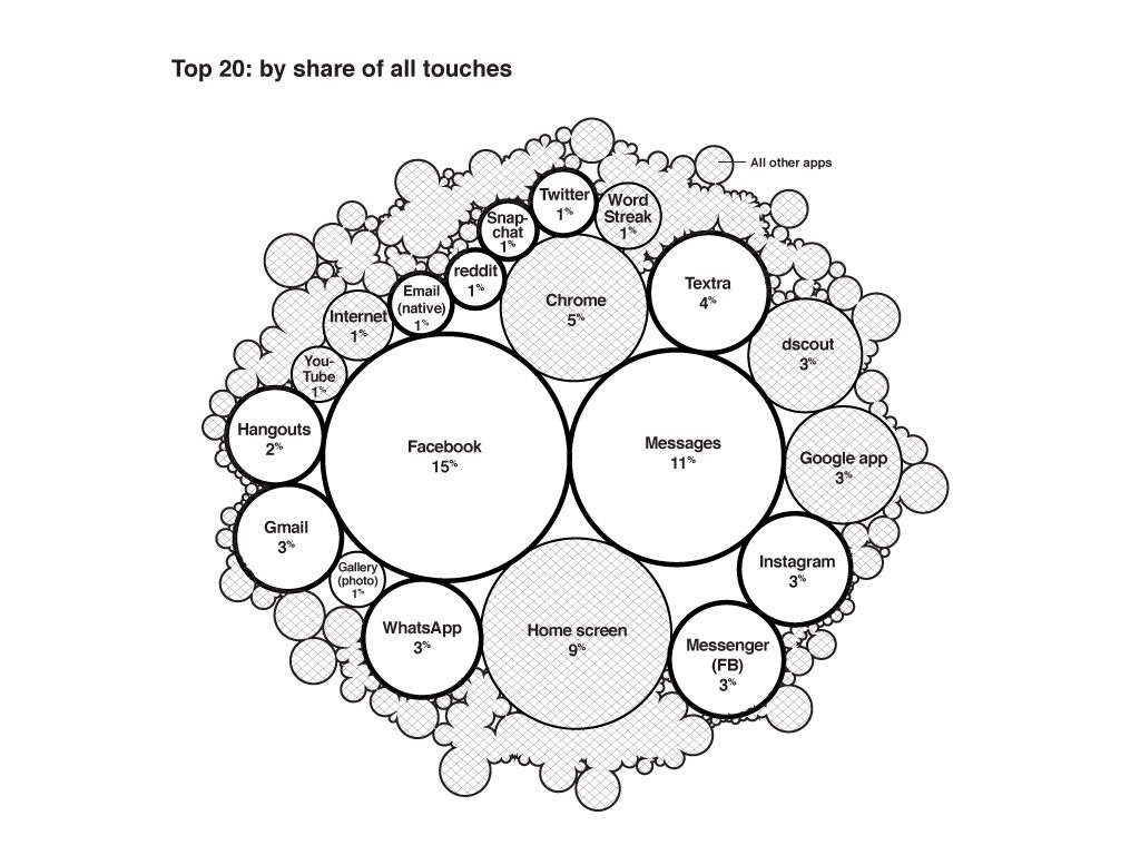 Back to FOMO, how can we not feel its effects when the web search – a space where we try to find specific information – is only 5% of our interactions with a smartphone? Number one? Facebook – place where we usually scroll the screen mindlessly. By adding other social media and messenger to it, they consume up to a quarter of our clicks!