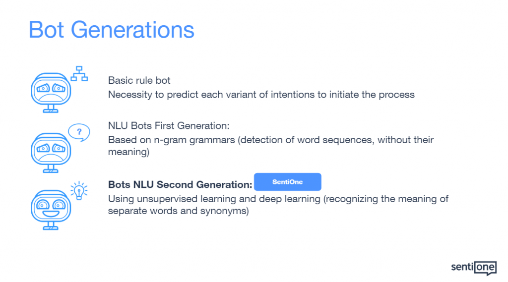The most advanced conversational bots are based on innovative solutions such as AI (artificial intelligence), NLU (natural language understanding) or ML (machine learning). They make it easy (from the point of view of the person configuring the bot) and effectively to train the bot to recognise the customer intentions, even if they are formulated in many different ways. Thanks to new technologies, bots are able to remember data and develop without human interference.
