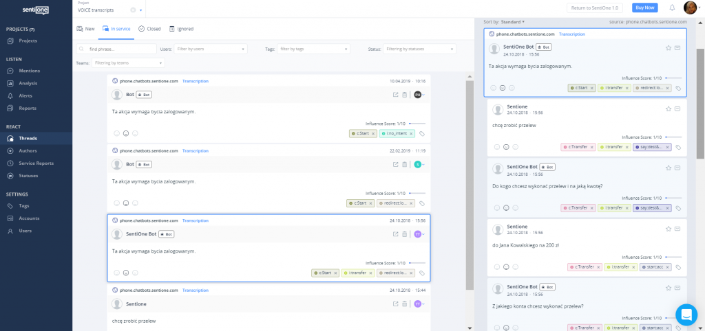 Thanks to the tools developed for monitoring the internet statements, such as SentiOne, we can easily verify changes in the number of brand mentions, their sentiment, and also take a closer look at the clients’ opinions to find out how customers react to the presence of the bot. Bots implemented by SentiOne are integrated with the Speech Analytics and Reporting module, which allows real-time analysis of the bot’s work and the correctness of the intent recognition effectiveness.