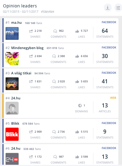 *a SentiOne saját fejlesztésű Opinion Leaders (Véleményvezér) algoritmusa listázza és rangsorolja azokat az egyéni online felhasználókat, akik a vizsgált időszakban a kutatásnak megfelelő témában a legtöbb publikus tartalmat tették közzé. Ezt a számot pedig kombinálja az adott felhasználó tartalmaira érkezett kommentek, megosztások, lájkok számával, valamint a követőbázis nagyságával.