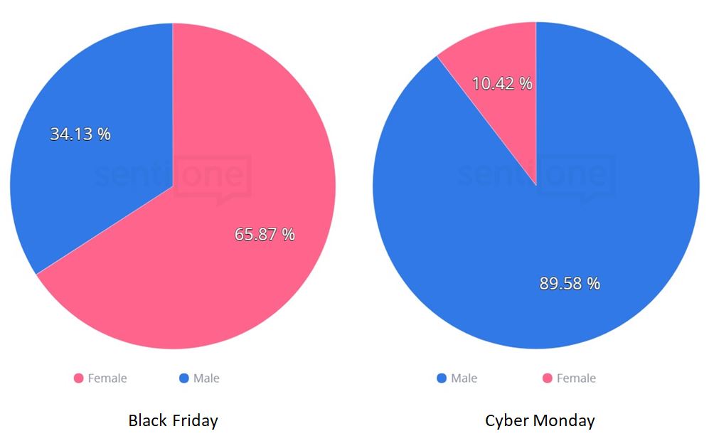 A Black Friday esetében az adatok azt mesélik, hogy a nők sokkal aktívabbak online. Jóval nagyobb arányban posztolnak és kommentelnek az akciókkal kapcsolatban, mint a férfiak. Az ábra szerint a pasikat inkább a Cyber Monday hozza lázba.