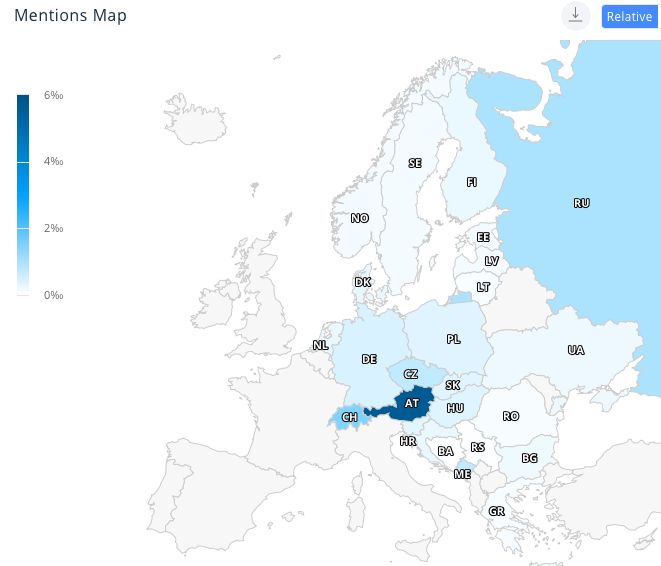 Európai viszonylatban az is kiderül, hogy milyen országok területén a legnépszerűbb a Bitcoinhoz kapcsolódó online kommunikáció. A térkép relatív értékeket mutat: azaz, hogy adott országban az összes hazai nyelven közzétett internetes bejegyzések viszonyában milyen nagy a Bitcoinhoz köthető említések aránya.