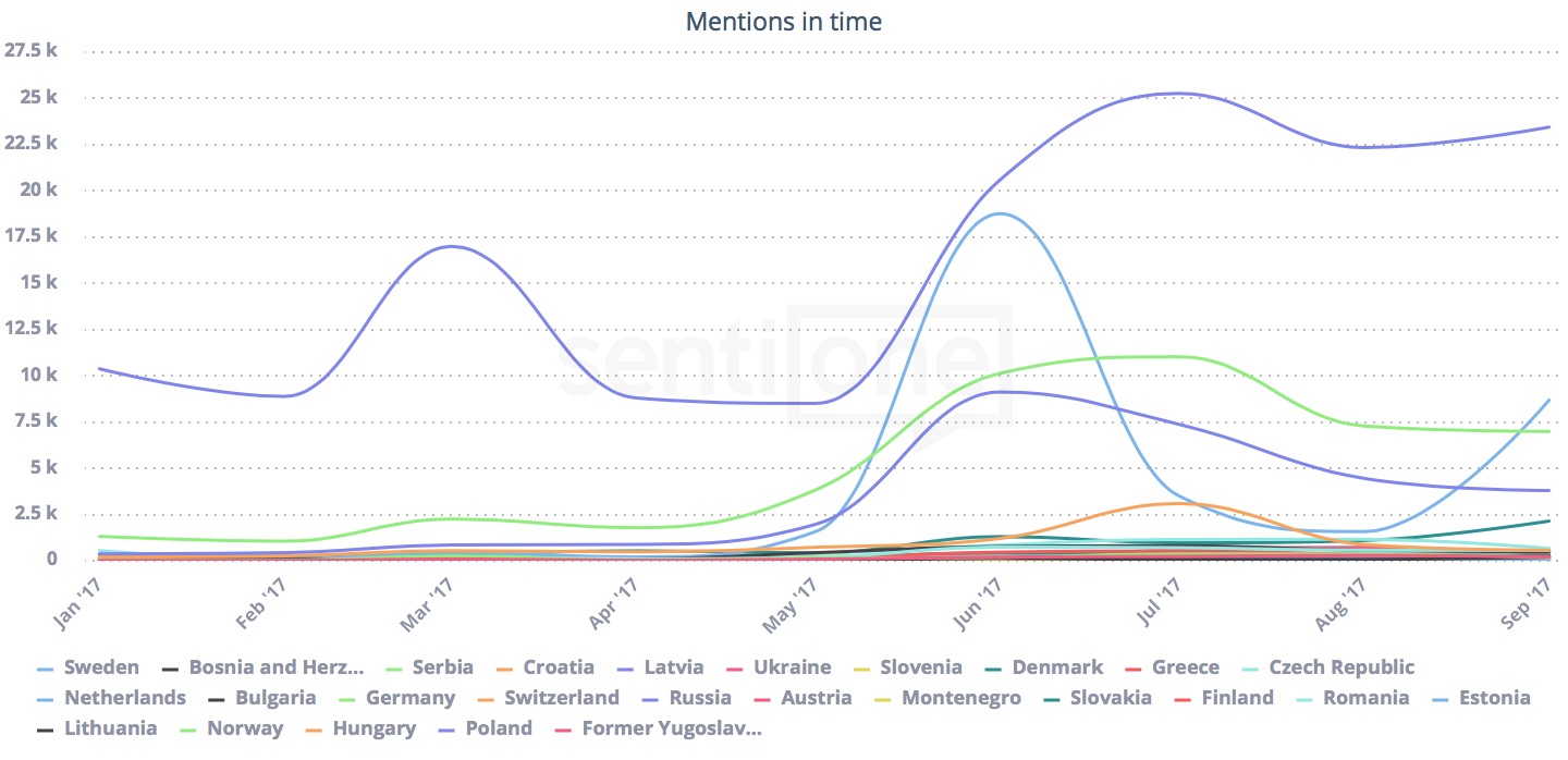 Egész Európát lefedő online listening cégként megvizsgáltuk a ‘Bitcoin’ és az ‘Ethereum’ kulcsszó megjelenési gyakoriságát Európa 27 országára vonatkoztatva is (2017. január 1. – október 11). Az említések gyakorisága alapján a Bitcoinról legtöbbször az oroszok, a németek, a lengyelek és a hollandok beszélnek online. Az Ethereum esetében a holland-lengyel pozíció cserélődik fel. Magyarország ugyanakkor mindkét esetben az élmezőnyben van: ötödik vagy épp hatodik helyen!
