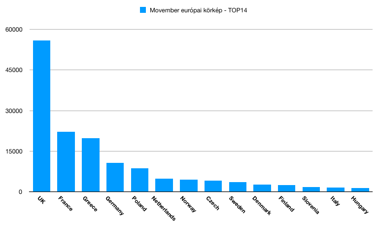 A Movember mozgalomnak természetesen nem szab határt se nyelv, se kultúra. A SentiOne kitekintett Európába is. A 2017. október 1. – november 27. közötti adatok és 30 ország eredményei alapján az alábbi TOP14-es lista állt fel (Magyarország a 14-ik) a Movemberhez kapcsolódó online közzétett tartalmak mennyisége alapján.