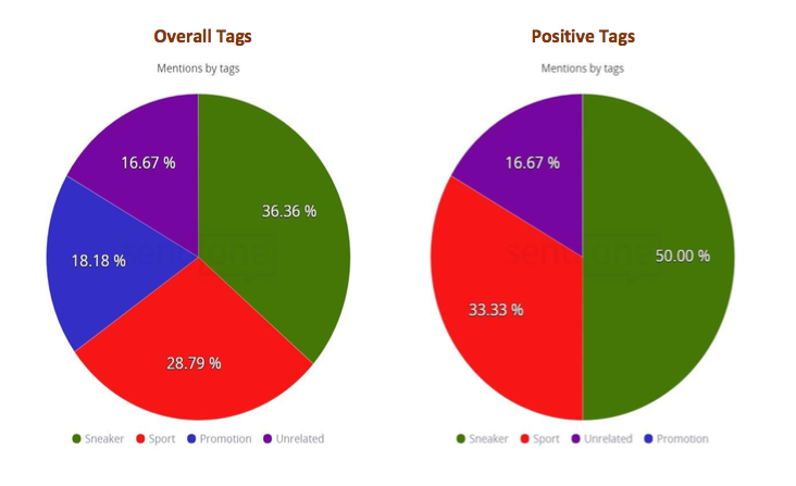 After finishing the tagging it became clear, that for Myadidas the categories Sneaker, Sport and Promotional together with Unrelated had a nearly equal share in all mentions. However, after setting the filter to positive, a different picture emerged… The tags Sneaker and Sport were able to increase their share, while no post classified as Promotion was perceived as positive. Accordingly, posts that have a closer fit with the brand are perceived as more positive by customers. The higher relevance of these posts to the customers may be one underlying reason for this phenomenon.