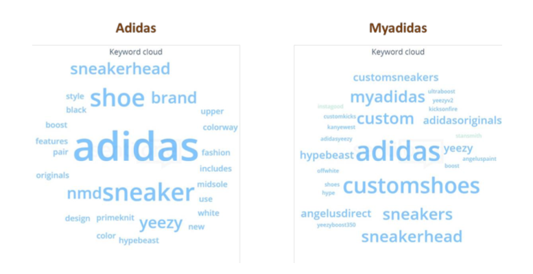 Since Myadidas customers individualize their products, Instagram seems like the perfect channel to publish their latest creations to their followers all over the world. In comparison, the buzz for standardized Adidas shoes and sneakers is more widely distributed, since articles written about these products are more likely to spread around different channels. Nonetheless, Instagram remains also for Adidas the most important source, mainly because customers tend to show their satisfaction with their latest purchases.