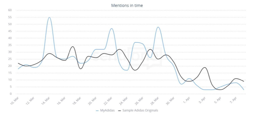 Therefore, we decided to analyze the online buzz for only one month (from 10.03.2018 to 8.04.2018). To avoid analyzing comparison posts with other brands, we excluded with Puma and Nike, the two most relevant competitors for the samples of Adidas and Myadidas.
