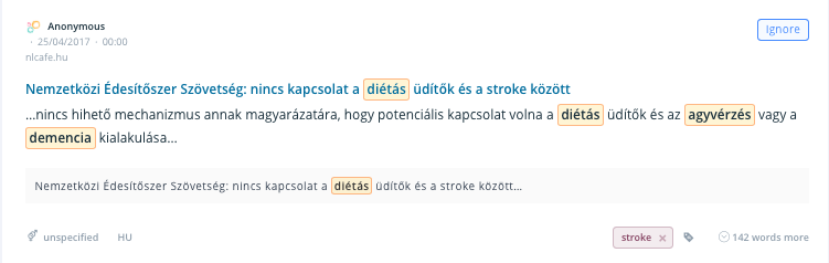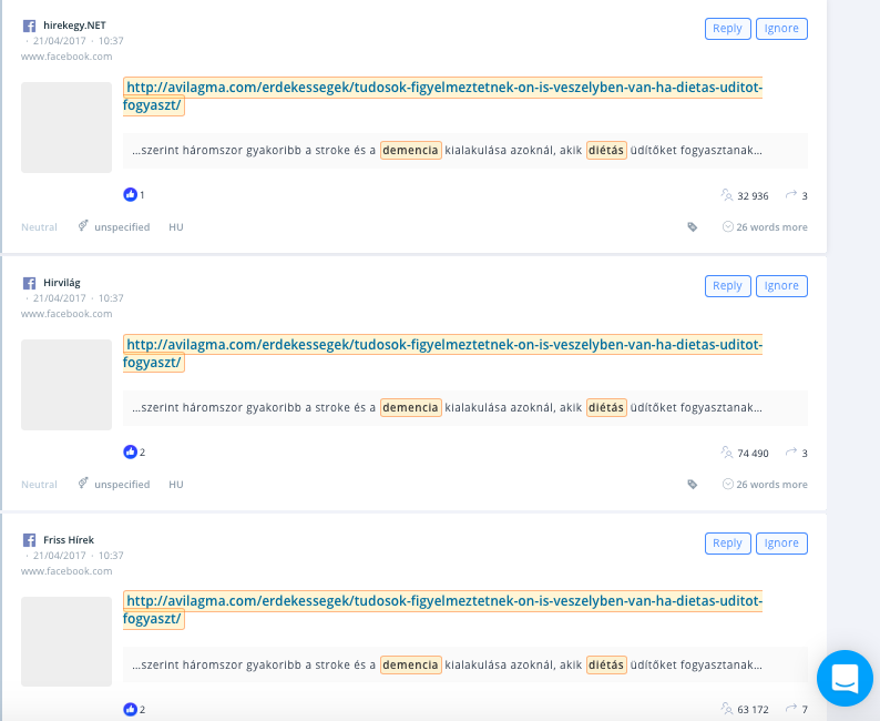 Néhány nap leforgása alatt több mint 50 online weboldal vette át/közölte le az anyagot, köztük a szeretlekmagyarorszag.hu, a divany.hu, az index.hu és még sokan mások. Végül adásba is került a hír a TV2 Tények című műsorában. A kutatást amerikai tudósok végezték, ahova a legtöbb oldal át is linkelt, vagy legalább lehivatkozta. Ugyanakkor. Ha már az indexnél veszed észre, hogy valami van, akkor késésben vagy. A social listeningen keresztül bármilyen szót, kifejezést monitorozni tudsz. Coca-Colaként például a fogyókúra, a cukorbetegség, a diéta, az agyvérzés, a fogszuvasodás vagy épp egyszerűen csak a mellékhatások kulcsszó nagyon is fontos lehet a márkát körbeölelő online kommunikáció esetében. Kifejezetten előny, hogy mindezt lehet kizárólag csak a márka, a szénsavas üdítők vagy épp a diétás üditők kontextusában vizsgálni. Így csak akkor kapsz értesítést, ha számodra releváns kontextusban jelennek meg a monitorozott kifejezések.