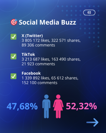 - Nearly 9.4 million interactions (likes, shares, comments)