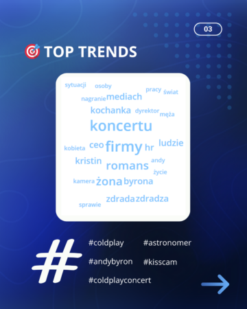Leading topics and hashtags fueling the online storm included: #coldplay, #astronomer, #andybyron, and #kisscam. Conversations were filled with words such as “infidelity,” “CEO,” “mistress,” “wife,” and “company,” proving that the public immediately connected the executive’s private life with his professional role and his company’s reputation.