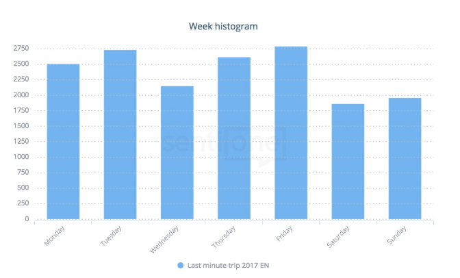When do we talk about last minute trips the most often? In general, despite the gradual increase in popularity of our vacation trips in periods that we don’t really associate with the need to use a sunscreen or beach towel, still, the most popular time to go on a well deserved break happens to occur between may and september. According to the research, people are the most eager to look for last minute trips or share their related experiences on Tuesdays and Fridays. This fact can serve as a valuable insight for travel agencies, when it comes to planning marketing budget and activities.