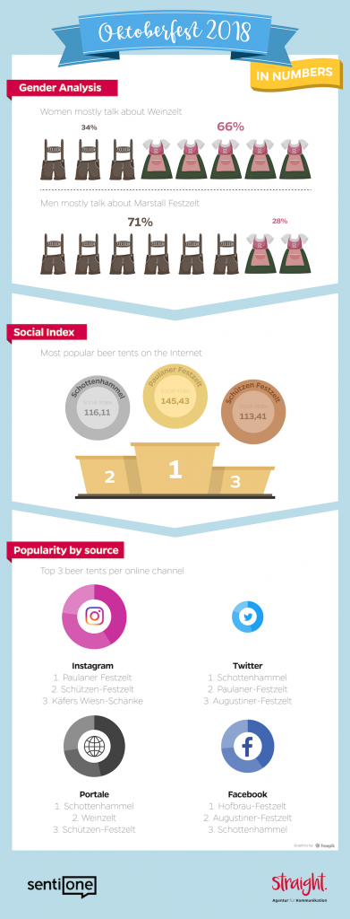 For three days the biggest folk festival in the world is over. 7.5 million litres of beer were served and more than 6 million people visited Munich in the last weeks, most of them did not forget to share this experience online. Having analysed more than 350,000 mentions from September 22 to October 7, we checked which beer tents were the most popular and other interesting insights.
