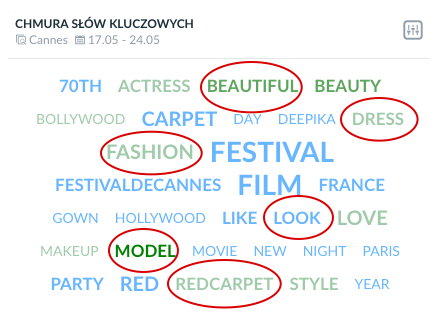 #CARPET #REDCARPET #BEAUTIFUL #FASHION #MODEL #DRESS – jak widać poniżej, to właśnie te słowa padały najczęściej obok tych będących w oficjalnej nazwie Cannes Film Festival.
