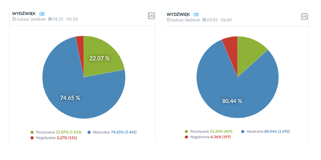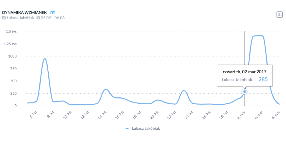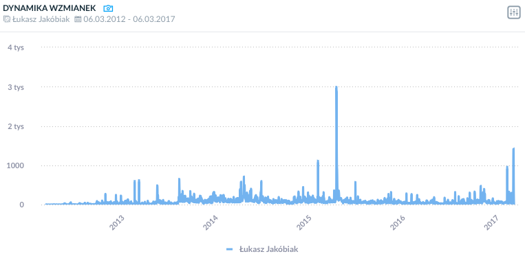 Biorąc pod uwagę wydźwięk dyskusji można powiedzieć, że Jakóbiak strzelił sobie w stopę. Wykres po lewej pokazuje, jak wyglądały wzmianki na jego temat od początku roku do końca lutego. Po prawej – od pierwszego marca, czyli środy, w którą wszystko się zaczęło.