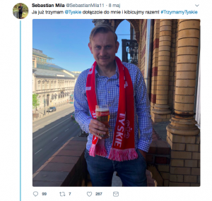 Kampanię promocyjną związaną z piłką nożną rozpoczęło też Tyskie, które sposób na zwiększenie sprzedaży podczas mistrzostw upatrzyło w hashtagu #TrzymamyTyskie – to właśnie z nim pojawiły się zdjęcia osób bezpośrednio związanych z reprezentacją Polski (Sebasitan Mila, Artur Boruc, Łukasz Wiśniowski). Fotografie publikowane były na profilach samych zainteresowanych, jednak największą dyskusję wzbudził udział w kampanii Zbigniewa Bońka – niektórzy internauci zastanawiali się czy prezesowi PZPN wypada promować piwo.
