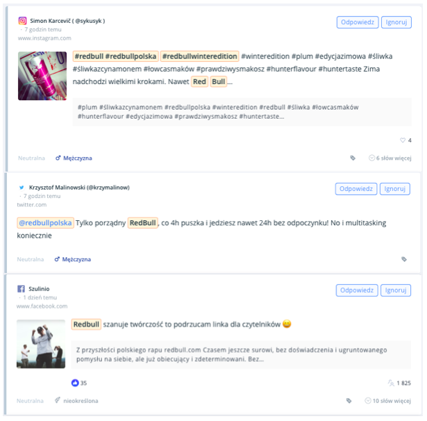 Przykładowe wzmianki na temat RedBull z social media w ostatnich dniach
