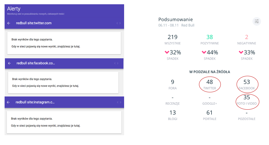 I tak, na przykład, sprawdzając wyniki na temat RedBull z Facebooka, Twittera i Instagrama w języku polskim, Google Alerts nie znajduje wzmianek. Odsyła nas do wcześniejszych publikacji, lub każe czekać na te, które dopiero się pojawią.